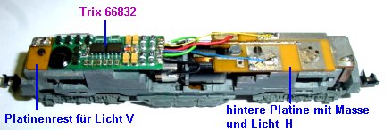 Umbauanleitung: Hier der Umbau mit einem TRIX 66832 in einem Platinenausschnitt.