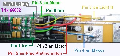 An den Decoder werden die Litzen bereits vorher angelötet, sofern nicht schon welche dran sind. Ausnahme Pin 5,
