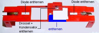 entfernen. Hier steht später der Decoder 66836 mit den Lötpads. Die beiden Federn über dem Motor werden vorsichtig