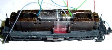 Dies ist die alte AusFührung der Minitrix 212. Gehäuse nach oben abziehen. Rotes Kabel von unten ablöten.
