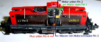 Links im Bild der eingeklebte Decoder, Pin 1 ist rechts oben. Pin 1 kommt an Motor oben, Pin 2 an Motor unten,