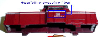 Nach der Probefahrt muß noch im Gehäuse in der oberen Hälfte innen 1/2 mm bis zum Fenster hoch weggefräst werden,