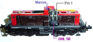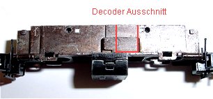 Seitenwand. Es braucht nichts im Gehäuse weggefräst zu werden. Die Leistung des Decoders reicht für die Lok aus.