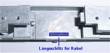 Alle Teile abbauen bis nur noch der Block übrig ist. An der Stelle der Kabeldurchführung einen längsschlitz bohren oder