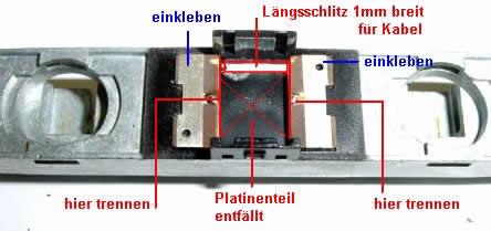 Die Schleiferplatine wie im Bild teilen und beide Teile einkleben. Das Mittelstück vor dem Schlitz entfällt. Das