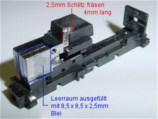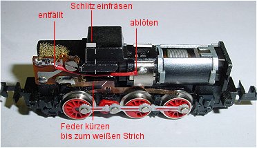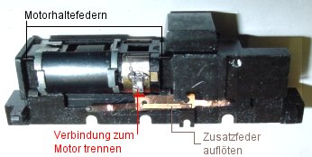 Auf der Rückseite des Metallblocks muss die Stromabnehmerfeder zum Motor abgeschnitten werden. Der Motor ist damit