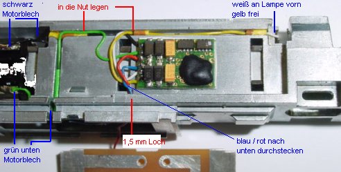 in den Nuten isoliert festklemmen. Von unten wird ein 1,5mm Loch nach oben zum Decoder gebohrt, hier werden die blaue und