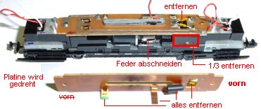 Die Platine muss ausgeschnitten werden, weil sie sonst mit Decoder nicht mehr auf dem Fahrgestellblock plan aufliegt.