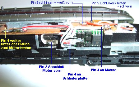 verbunden. Pin 5 kommt an die Leiterbahn ganz hinten außen für Licht weiß hinten = rot vorne. Pin 6 an die zweite