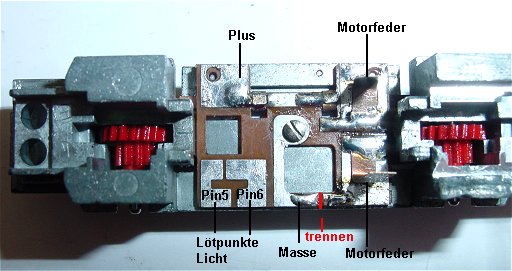 Gehäuse von Motorwagen durch Entfernen der vier Puffer und Spreizen der Seitenwände abnehmen. Kennzeichnen wo