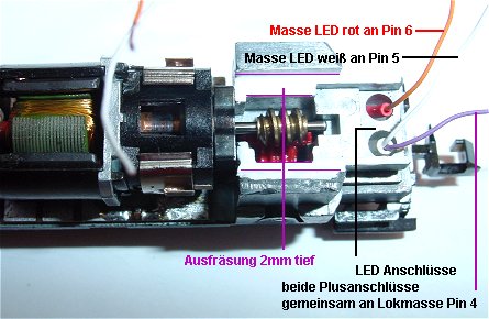 und Birne rot links kommen an den gleichen Lötpunkt von Pin 5. Birne weiß links und LED rot rechts an Lötpunkt 6.