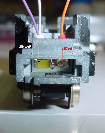 sind dann hier statt der zwei Birnen zwei LEDs eingelötet und das schwarze Plastikteil der Lampenhalterung