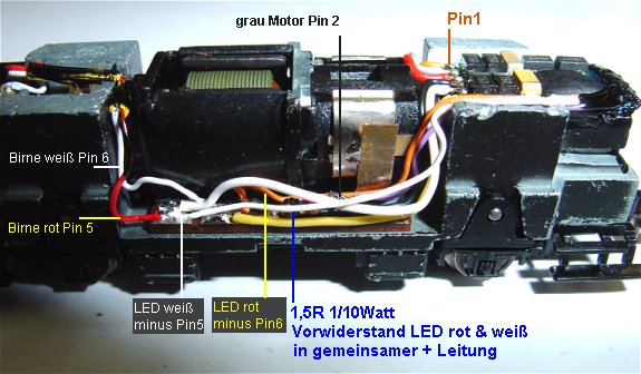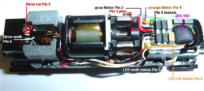 Decoder DHL100 ist aufgeklebt. Pin 1 orange Führt an Motorfeder oben im Bild.