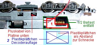 über der Schnecke, 2 Plättchen so groß wie der Decoder darauf. Damit hat die Schnecke freies Spiel und der