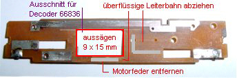 Umbauanleitung: Hier der Umbau mit einem TRIX 66836 in einem Platinenausschnitt.