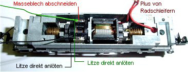 Vom hinteren Kohleblech wird die abstehende Feder abgeschnitten. Damit ist der Motor massefrei.