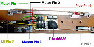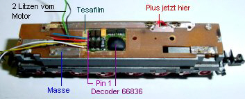 Der Decoder Trix 66836 ist eingelegt, Anschlüsse nach links, Pin 1 ist oben. Die Plusleitung wird jetzt an die