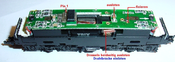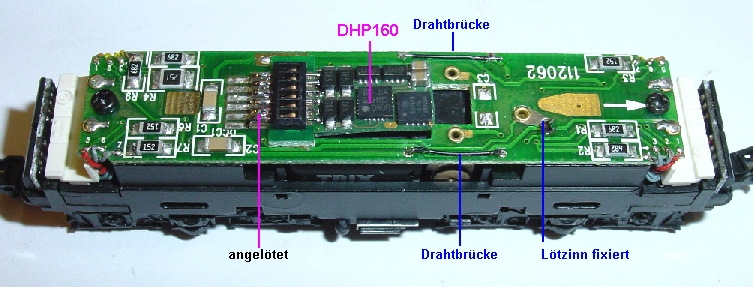 Umbauanleitung: mit DHL 160 Multiprotokolldecoder DCC / SXGehäuse seitlich spreizen, nach oben abnehmen. Analogplatine herausziehen, beide Drosseln auslöten (oder mit Draht überbrücken), Kondensator auslöten, eventuell Umschalter mit einem Lötpunkt fixieren. Platine bearbeitet. Statt Drosseln je eine Drahtbrücke eingelötet. Kondensator zwischen den Motoranschlüssen ausgelötet, Decoder DHP160 in Schnittstelle gesteckt und dahinter festgelötet.