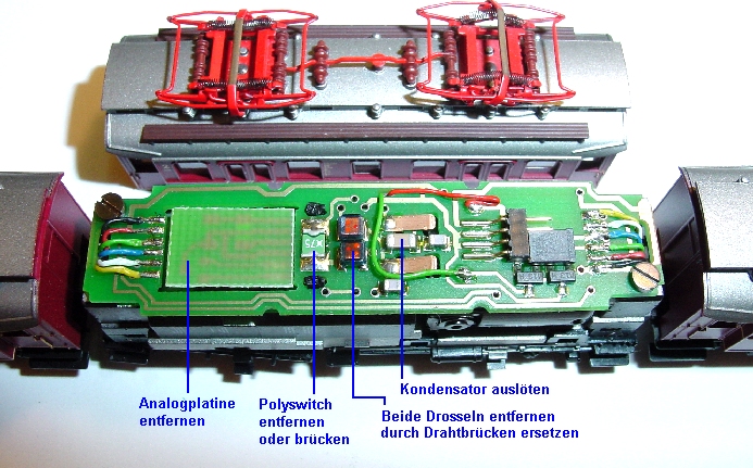 ersetzen. Kondensator nur auslöten, Blechstreifen im Dach entfernen, ein Oberleitungsbetrieb ist nicht möglich.