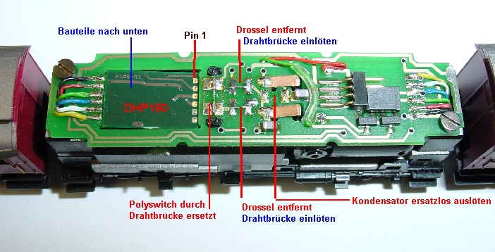 Der DHP160 ist kopfüber eingeschoben und die drei Drahtbrücken eingelötet. Wer einen anderen Decoder benutzt,