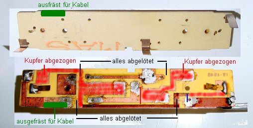 Auf dem Bild grün ist die kleine Ausfräsung für den stehenden Kühn-Decoder.
