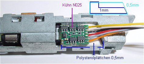 Der Kühn DCC N025 Decoder ist eingeklebt. Er sitzt auf dem weißen Plastikplättchen, Anschlüsse links, Pin 1 oben.