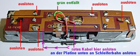 Das grüne Kabel wird abgelötet und das rote an den schmalen Steg der Schleiferplattenverbindung gelötet.