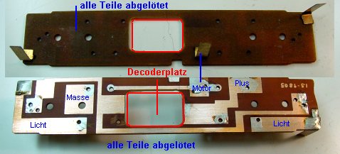 In der Mitte wird aus der Platine ein Loch in der Größe des Kühn N025 Decoders ausgesägt oder gefräst. Der Decoder