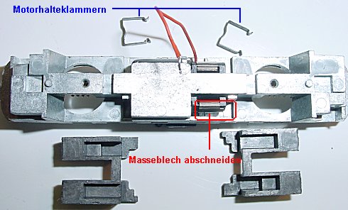 Der Motor wird ausgebaut durch herausziehen der Halteklammern. Dann wird am rückwärtigen Kohleblech die umgebogene