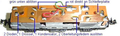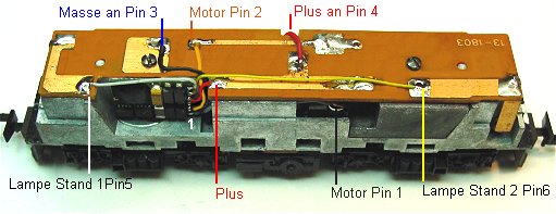 Decoder eingeklebt und verdrahtet. Pin 1 grau an Motor-Kohleblech im Vordergrund. Pin 2 orange an Leiterbahn zur