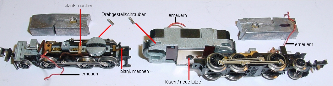 Beide Drehgestelle sind entfernt um die Lampenlitzen zu erneuern, für den Umbau sind die Originallitzen zu kurz.