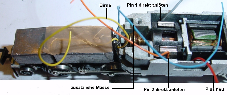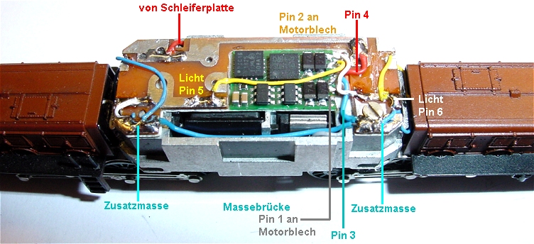 Bei einer Lok mit guter Masseverbindung entfallen die beiden blauen Litzen links und die Massebrücke.