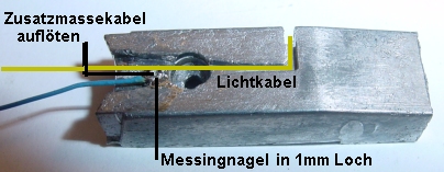 Bohrung im Ballastblei stecken und hier eine Masselitze ablöten. Dann hat man natürlich zwei Litzen zur