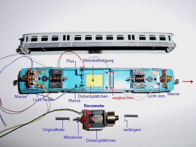 Motorgehäuse der Steg entfernt, um Platz für die Schwungscheibe des Rocomotors zu schaffen. Die beiden eingenieteten Federn