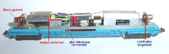 die Lampen angelötet. Wenn man die Lampenhalterung mit Sekundenkleber in den Wagenboden einklebt, kann man die Haltefedern