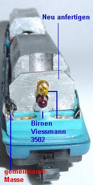 Die beiden Lämpchen sind von Viessmann 3501 und 3502 weiß und rot. Sie werden mit einem Ende zusammen an Masse gelötet.