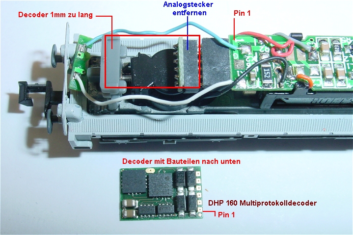 Analogstecker herausziehen, graue Decoderauflage zum Bearbeiten unten ausrasten. Pin 1 oben an der Platine, am Decoder unten,