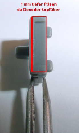 Der Platz für den Decoder ist nicht lang genug, deshalb muß links vom Rand 1mm weggeschnitten (gefräst) werden und da der