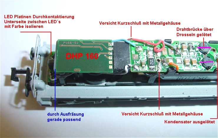 Dabei liegt der Decoder mit den beiden Kondensatoren 3 mm hoch über der Auflage weil diese auch noch einen Rand hat.