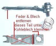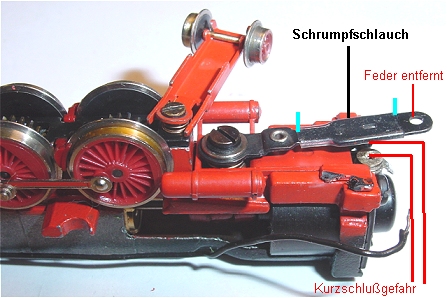 einklemmt, es ist der Lötpunkt Motor unten Pin 2. Die Stahlfeder wird entfernt, Deichsel wird mit Schrumpfschlauch isoliert