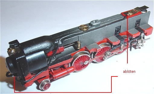 Die Tenderdeichsel wird vom Lokrahmen abgeschraubt, Federblech entfernen und kürzen. Das rechte Teil wird mit der KohleHälse