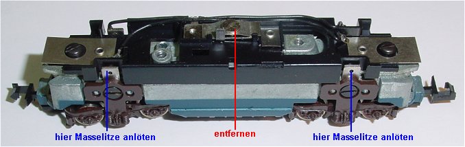 Der Motor wird nach oben entnommen und das Masseblech unter der Kohlehalterung entfernt. An die Kohlehalterung wird die
