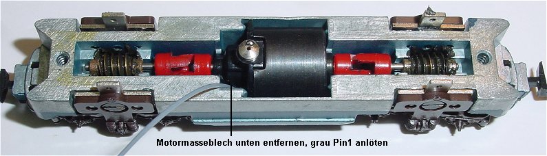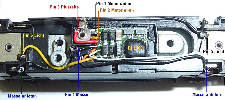 Der Decoder DHL 100 ist eingeklebt und verdrahtet. Pin 1 Motor unten, Pin 2 orange Motor oben, Pin 3 rot Plus oben, Pin 4