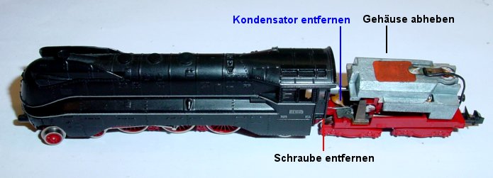 Schraube unter der Lok in der Mitte herausdrehen und Gehäuse nach oben abnehmen.