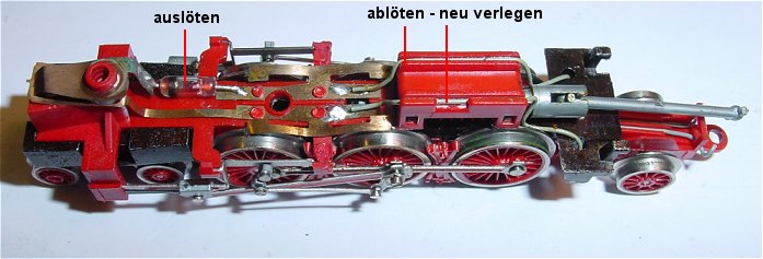 Beide restlichen Litzen von der Lok kommend werden abgelötet und die Motorfedern am Boden bändig abgeschnitten. Die Feder