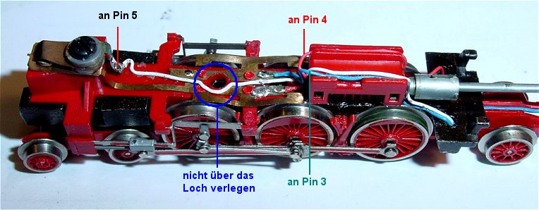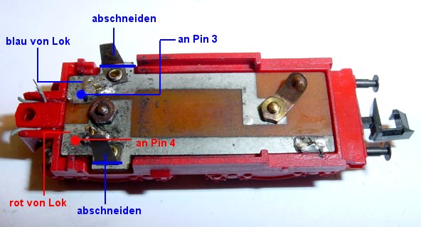 An dem blauen und roten Lötpunkt werden je eine Litze für Decoder Pin 3 und 4 angelötet.