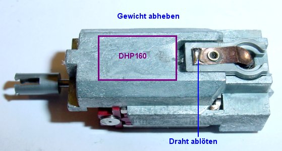herausgezogen um die Führungen aus Plastik nicht durch die Löthitze zu verformen. Nach Ablöten Motorkohlen reinigen und wieder