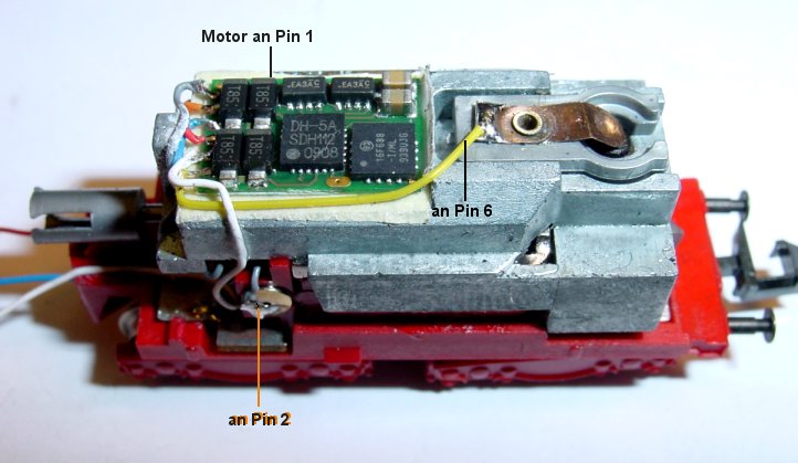 Decoder ist aufgeklebt. Pin 6 gelb wird an die hintere Birne gelötet.