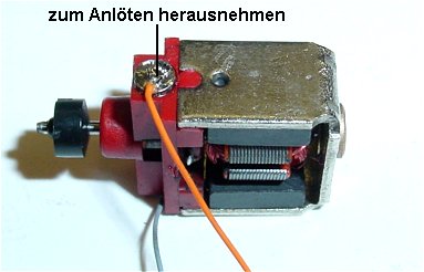 abgeschnitten werden wird je eine Litze grau und orange an die MotorkohleHälsen gelötet. Dazu werden die Hälsen aus der