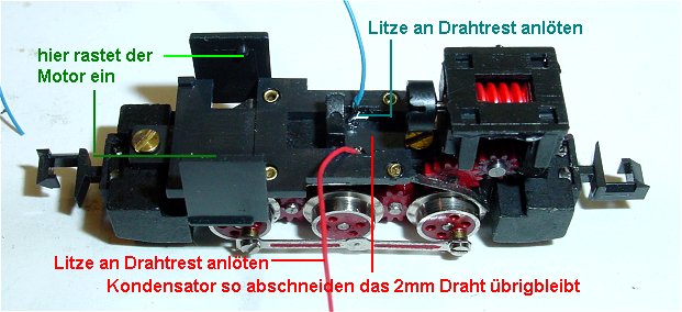 Kardanfeder wird so abgeschnitten das jeweils 2 mm stehen bleiben. Hieran werden die Litzen rot und blau (schwarz) gelötet.